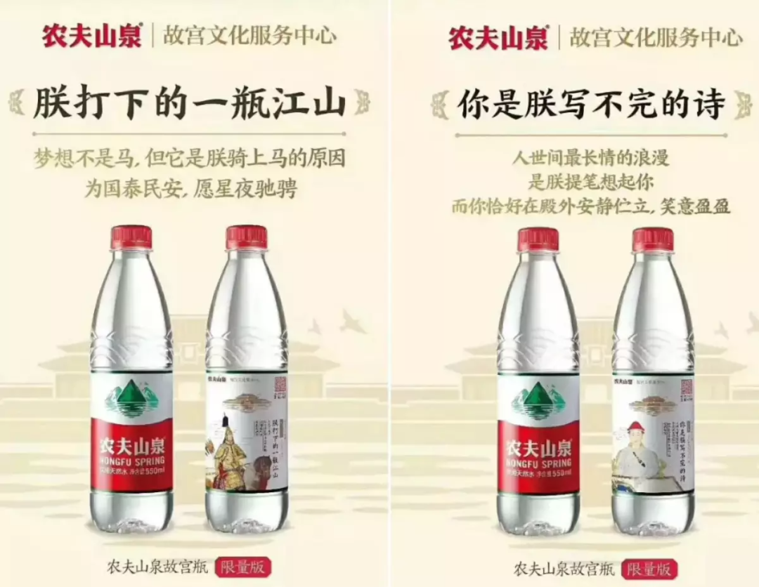 農(nóng)夫山泉在2018年和故宮文化服務(wù)中心推出了9款限量版的“故宮瓶”,更是一舉引發(fā)了網(wǎng)友們的熱議。在瓶身上聯(lián)名做文章,最早出名的當(dāng)屬咖啡巨頭星巴克的城市杯。而這一次,農(nóng)夫山泉則是結(jié)合中國傳統(tǒng)文化,將解構(gòu)故宮人文的視角文案直接刻在了瓶身上。