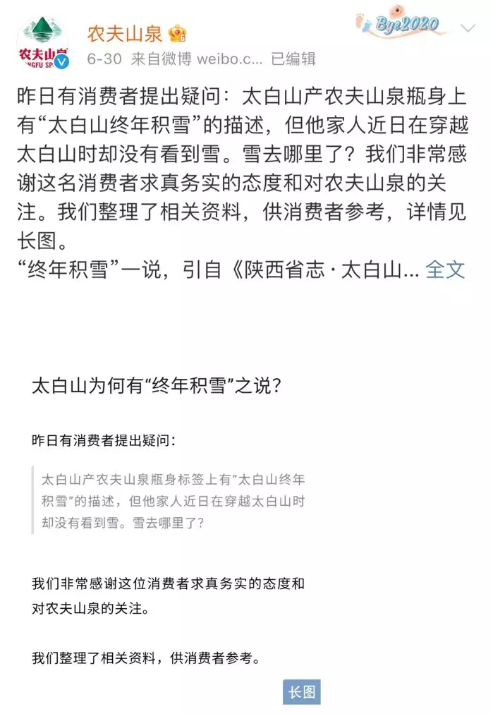 對此,農(nóng)夫山泉當(dāng)時以“論文式”的長篇回應(yīng)再次引起諸多關(guān)注,回應(yīng)提及“終年積雪”一說,引自《陜西省志·太白山志》等古典名著,太白山橫跨三個縣,五六月下雪常有,在一些海拔高且背陰的地方往往有積雪保留。并澄清:作為標(biāo)簽文字,應(yīng)該充分考慮消費(fèi)者的感受。凡是會引起疑義的,會加以避免。