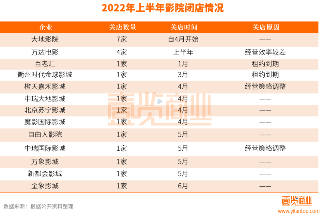 從停業(yè)閉店的情況來看,2022上半年,至少有22家影院宣布閉店停業(yè),涵蓋大地影院、百老匯、中瑞大地、萬象影城等13個影院品牌。