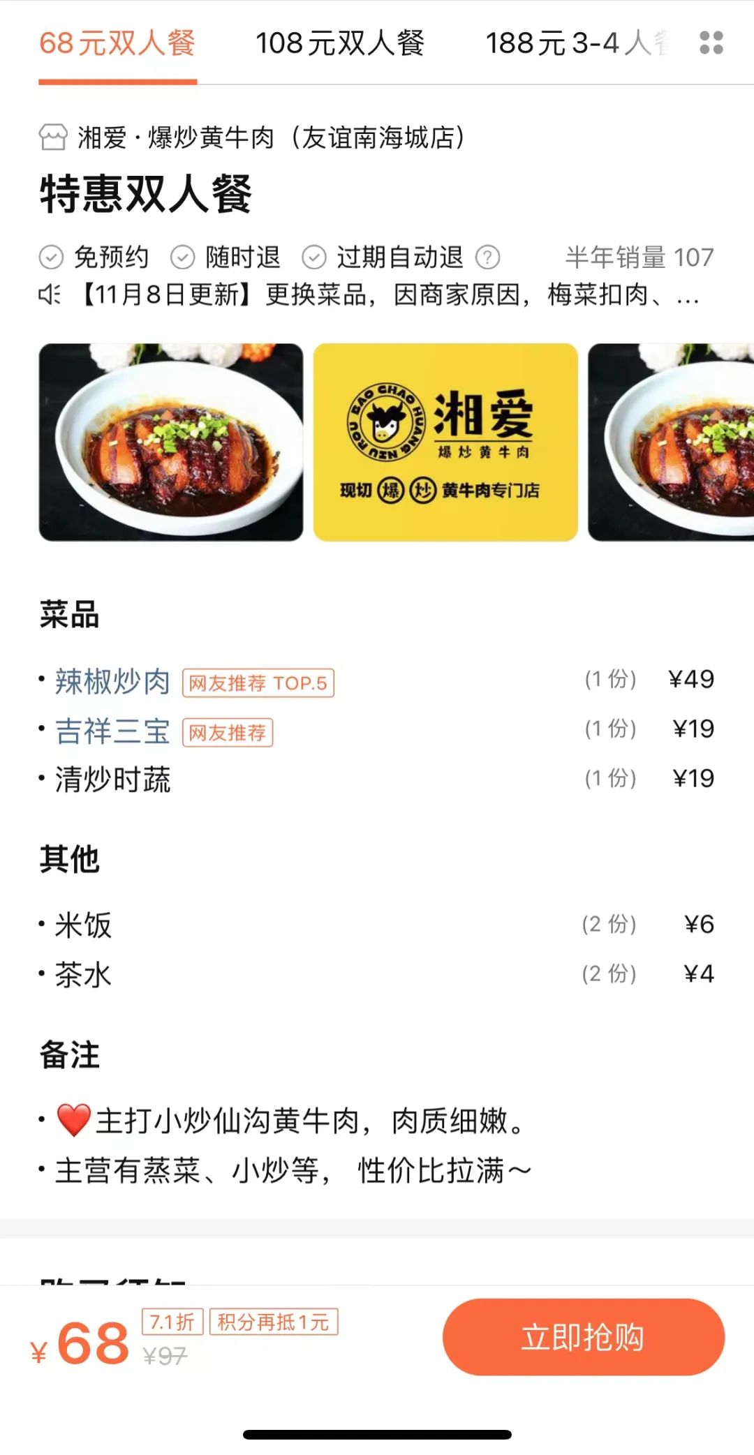 現(xiàn)在門店還推出了很多打折優(yōu)惠套餐,2人套餐包含三種葷素搭配的菜加米飯只要68元。