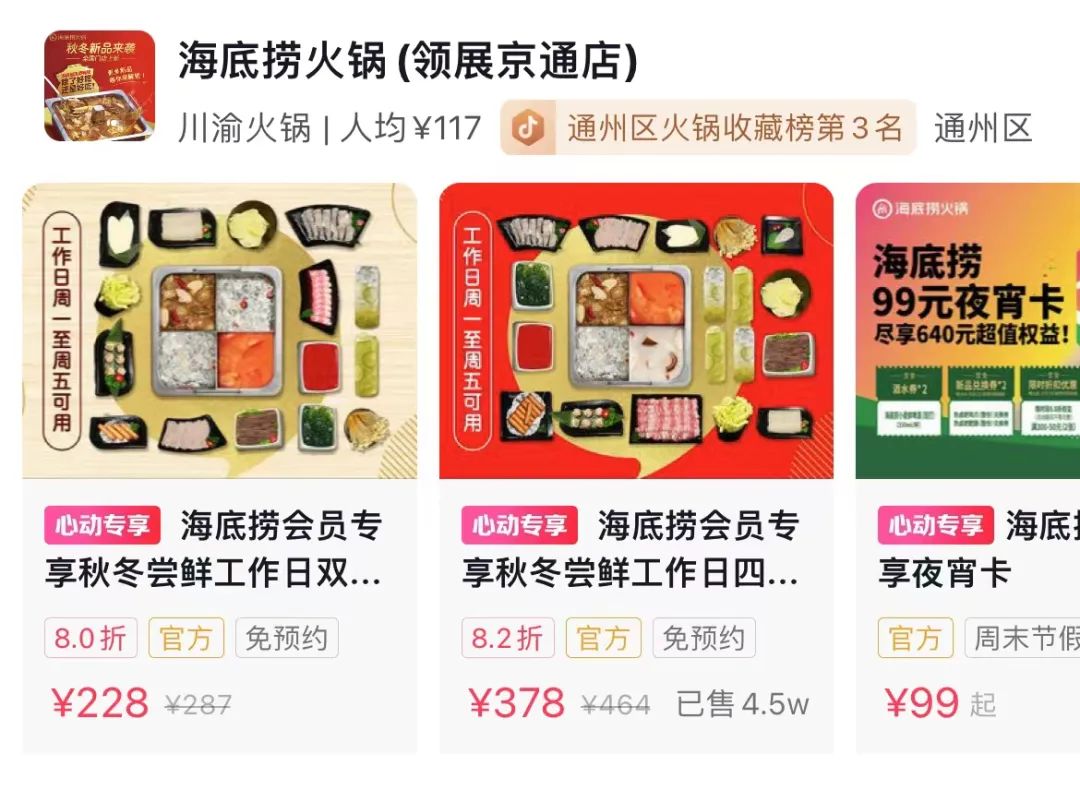 進(jìn)入十月以后,海底撈就一直在做各種打折、團(tuán)購活動(dòng),包括還開了品牌直播間,專門主推新品和團(tuán)購套餐活動(dòng)。