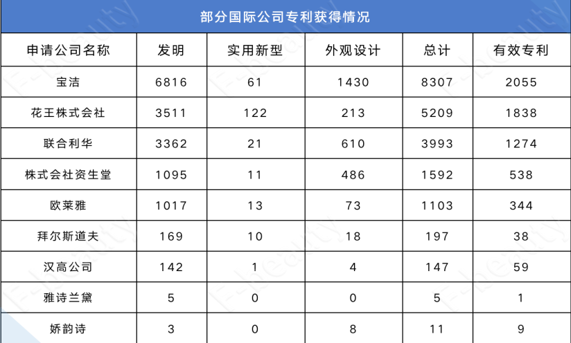 其中,歐萊雅、拜爾斯道夫、聯(lián)合利華、花王、雅詩蘭黛等公司的發(fā)明專利,均以申請(qǐng)國際專利的方式獲得知識(shí)產(chǎn)權(quán)保護(hù)。