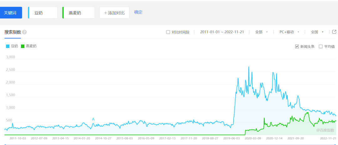 植物奶市場(chǎng),除了豆奶,也包括燕麥奶等細(xì)分類目。百度指數(shù)顯示,較晚才走進(jìn)大眾視野中的燕麥奶,經(jīng)過(guò)短時(shí)間的發(fā)展,已明顯縮小與豆奶的差距,即將追上后者的市場(chǎng)聲量。