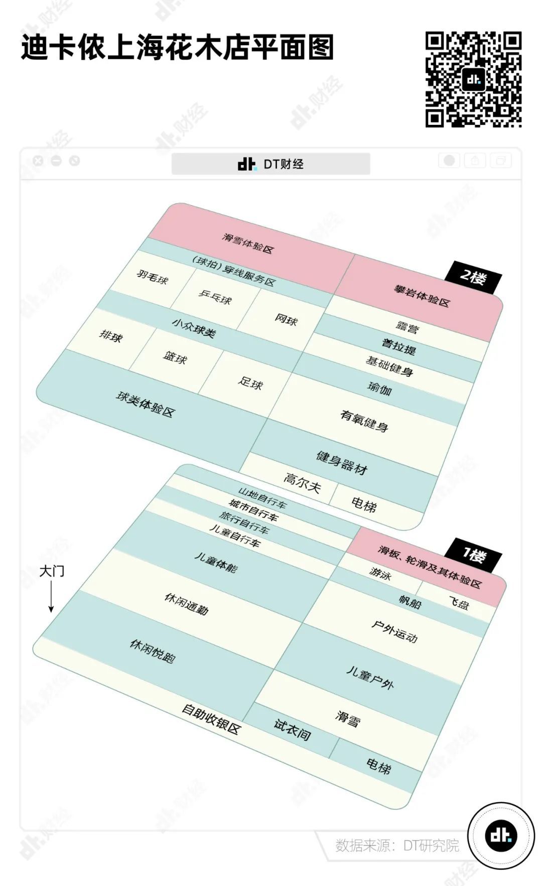 這一點(diǎn)從迪卡儂線下店的布置就能看出來(lái)。DT財(cái)經(jīng)去迪卡儂上;镜旯淞艘蝗,根據(jù)實(shí)地觀察繪制了如下平面圖。