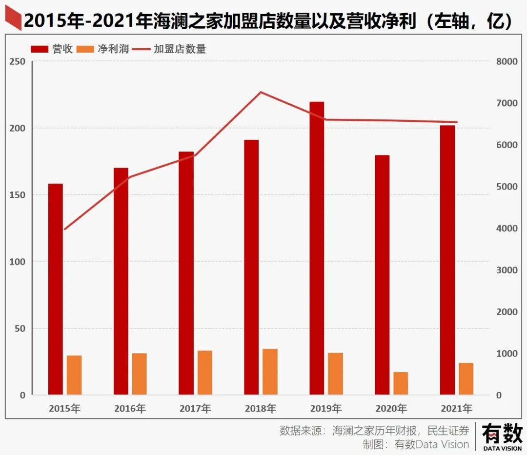 加盟模式飛速擴(kuò)張水到渠成,營收凈利一同起飛,最終在2015年,海瀾之家成功坐上中國男裝的頭把交椅。