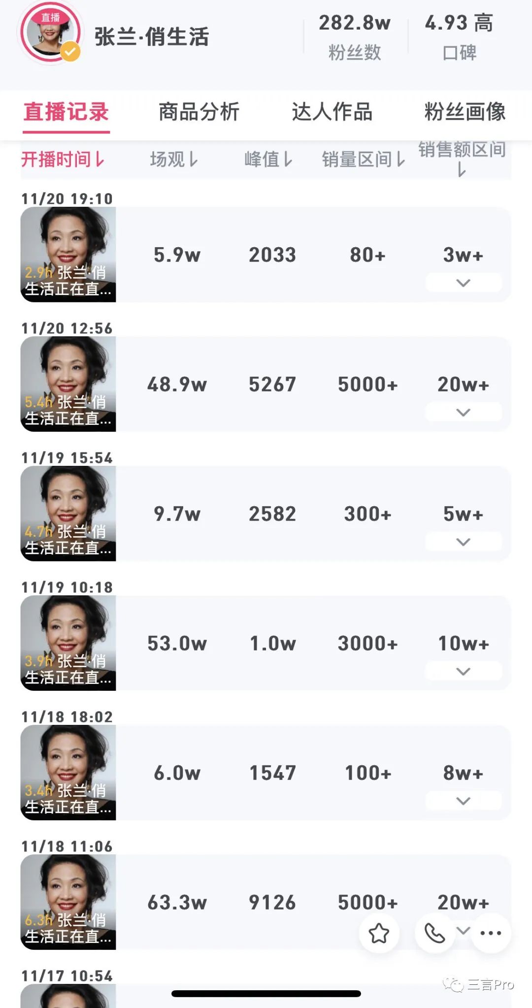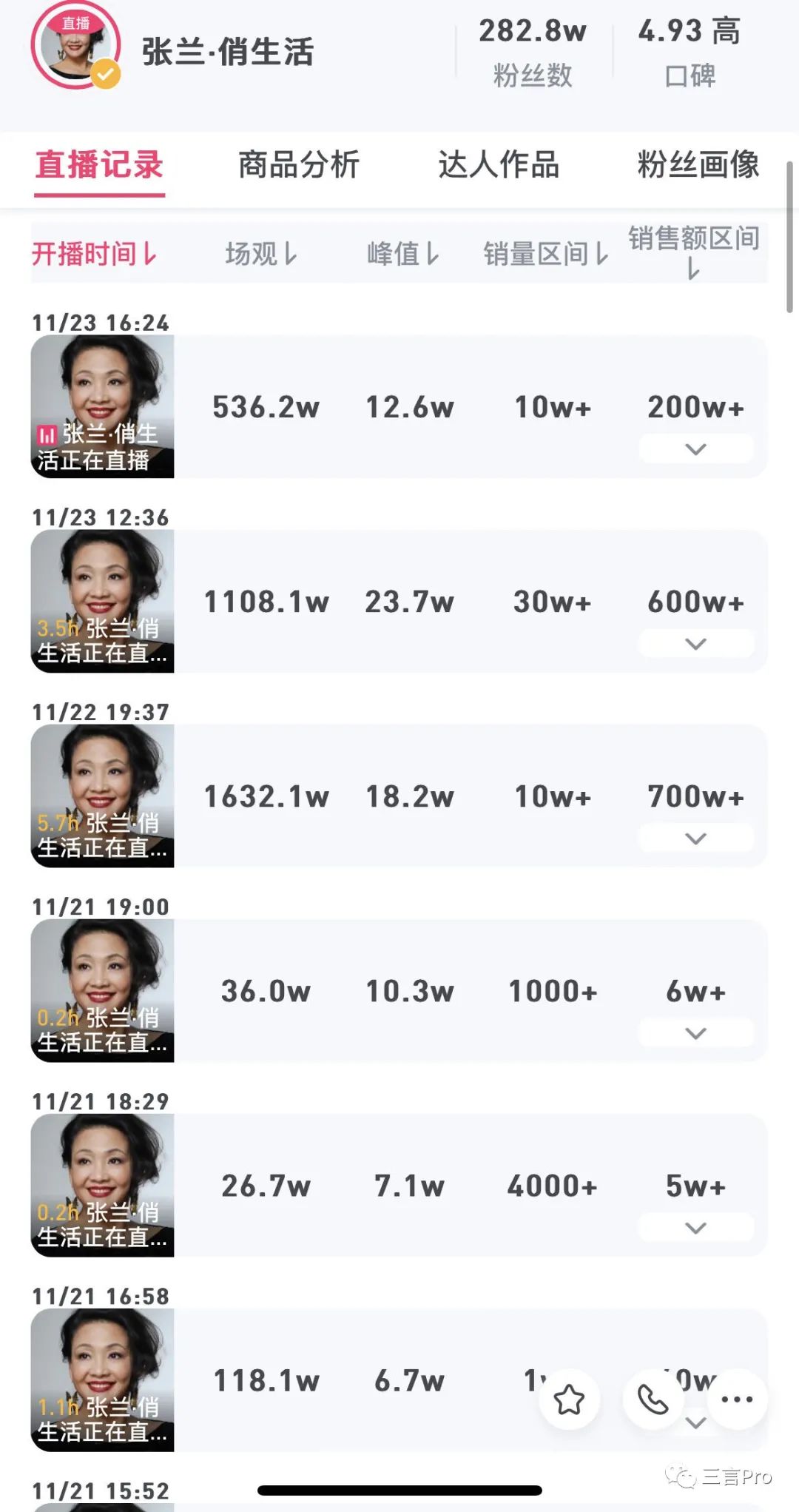 事實上,如果不和近三天的直播相比,6個月前張?zhí)m和麻六記的直播銷售額與近3個月的銷售額并沒有多大差距。