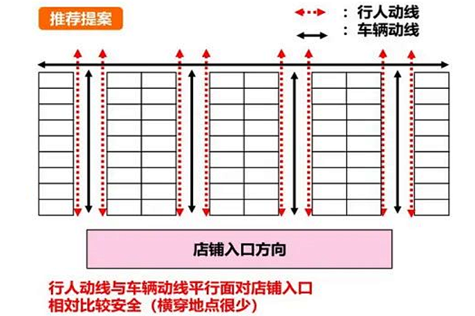 如下圖的一個停車場案例,傳統(tǒng)將車尾朝向店鋪入口方向的做法,容易造成停車動線和人出入動線的交叉,造成一定的安全隱患。