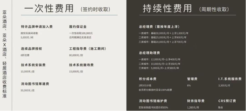 在自營模式下,亞朵負責(zé)整個酒店的運營,包括人員、房租、裝修等等;而在加盟模式下,加盟商負責(zé)酒店的裝修、維護以及酒店的日常開銷(員工薪酬、酒店及客房耗材、租金、其他維護費用),也包括亞朵派駐的管理人員的工資,此外還需要向亞朵支付房費的5%作為加盟。