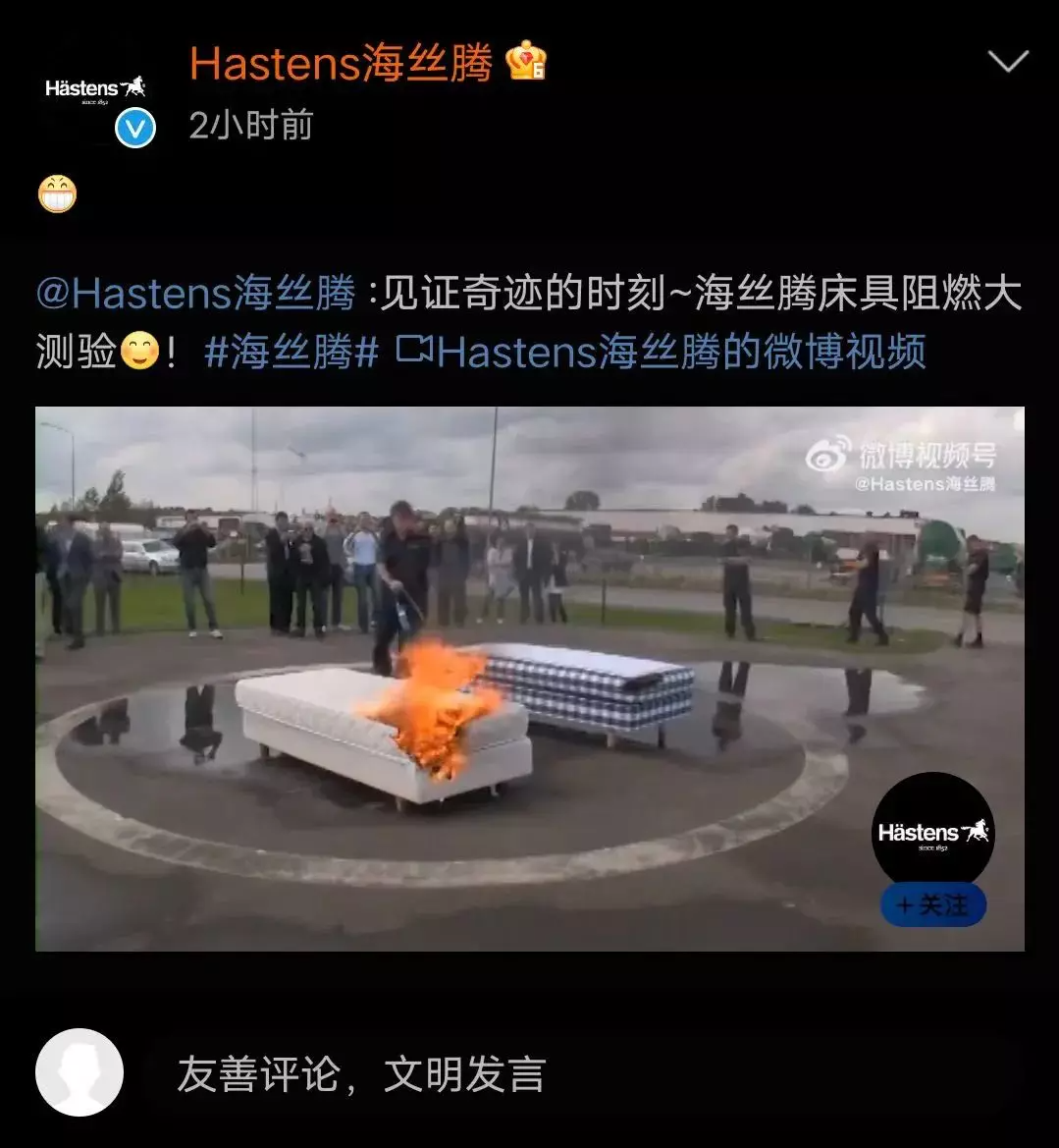 11月23日,汪小菲再次發(fā)微博怒稱(chēng)要把床墊燒了。緊接著海絲騰品牌官方回應(yīng)(蹭熱點(diǎn)),發(fā)布測(cè)驗(yàn)視頻證明他們家的床具是阻燃的。