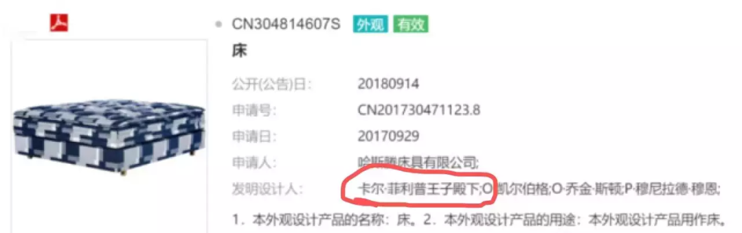 外觀專(zhuān)利的設(shè)計(jì)人是瑞典王子。海絲騰一款名為APPALOOSA的床墊的發(fā)明設(shè)計(jì)人一欄有個(gè)極其顯眼的稱(chēng)呼“卡爾·菲利普王子殿下”,不僅是第一設(shè)計(jì)人,他同時(shí)還是瑞典王位的第四順位繼承人。
