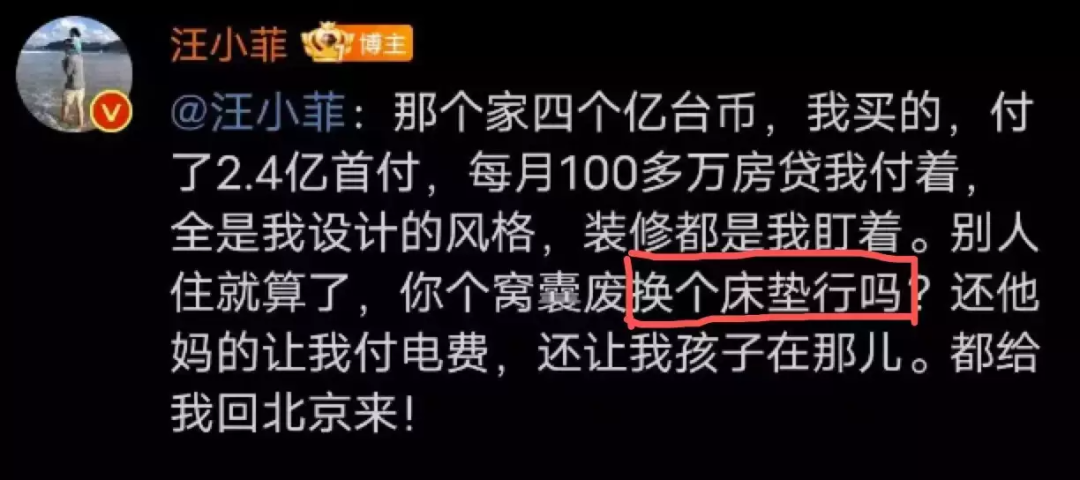 在播放該電影前,汪小菲在微博“憤怒發(fā)泄”,稱(chēng)一直在為前妻大S一家付電費(fèi),而他們還霸占了自己買(mǎi)的床墊。