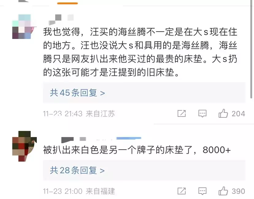 不過(guò)各位網(wǎng)友也表示,不一定是大S寄了個(gè)假的回來(lái),本來(lái)就沒(méi)有人說(shuō)這床墊值多少錢(qián),是什么牌子。全程都是網(wǎng)友們自己好奇有錢(qián)人睡的床墊到底有多好。