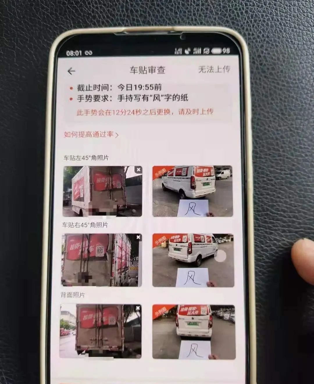 據(jù)《南方周末》報(bào)道,貨拉拉司機(jī)培訓(xùn)手冊(cè)顯示,司機(jī)需在限定期內(nèi)上傳車貼審查照片原圖,照片必須從車尾正后方、左右兩側(cè)45度角方向拍攝,并在拍照時(shí)比劃當(dāng)月指定的手勢(shì)或物品,如舉拳等。