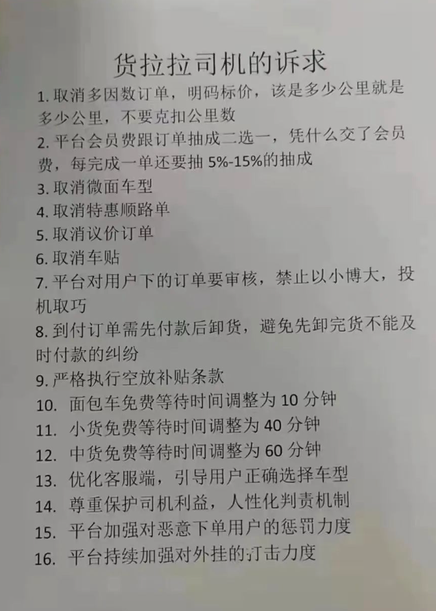 網(wǎng)上流傳較廣的一張“貨拉拉司機(jī)的訴求”文檔圖片中,共有16條內(nèi)容;而在一些貨拉拉司機(jī)微信群里,同樣有其他的訴求文件?偟膩(lái)說(shuō),各地司機(jī)的訴求不盡相同,但在核心目標(biāo)上是極具聚焦的: