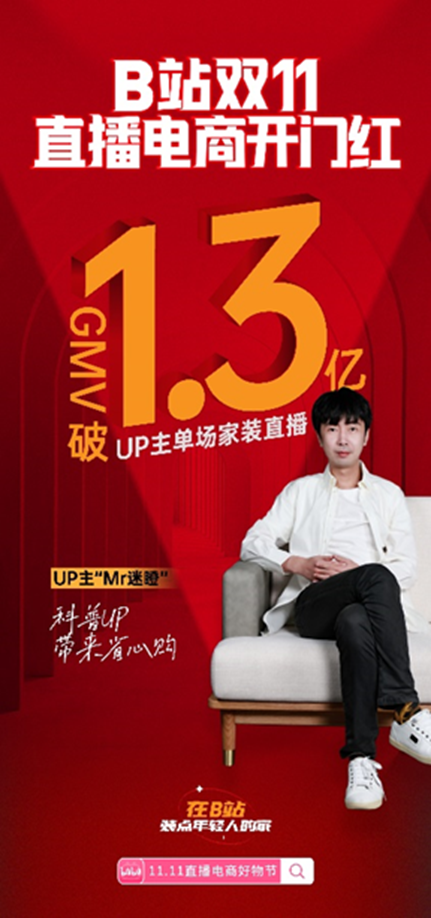 多個(gè)直播主參與雙11,涵蓋品類包括家電、家具等。最具代表性的是B站家裝垂類UP主“Mr迷瞪”,在雙11首場(chǎng)直播就創(chuàng)下了1.3億GMV的好成績(jī),可謂是打破了B站單場(chǎng)帶貨紀(jì)錄,甚至超過了B站在618時(shí)的直播帶貨總成績(jī)。