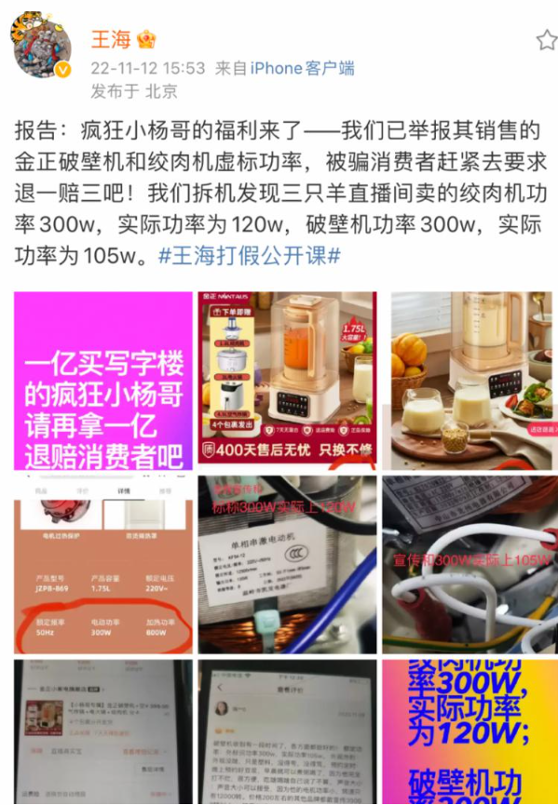 還沒(méi)有沉浸在買樓的快樂(lè)中太久,職業(yè)打假人王海在微博上表示,瘋狂小楊哥直播間出售的破壁機(jī)和絞肉機(jī)涉嫌虛標(biāo)功率。王海透露,若按399元的售價(jià)、6.8萬(wàn)的銷量以及退一賠三的標(biāo)準(zhǔn)計(jì)算,瘋狂小楊哥的賠付金額將超過(guò)1億元。