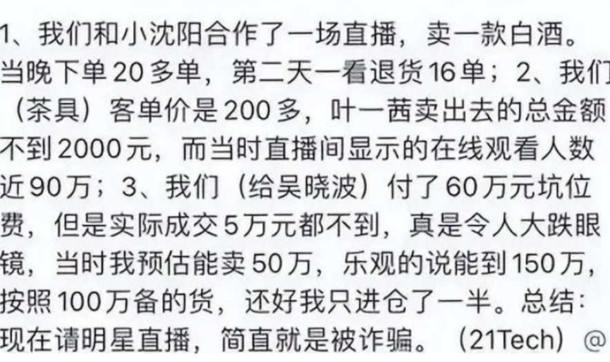 據(jù)媒體報(bào)道,此前某商家花 80 萬(wàn)請(qǐng)李湘賣貂,結(jié)果銷售額 0 元;一家按摩儀公司花 51.5 萬(wàn)元請(qǐng)陳小春帶貨只賣 5000 元;小沈陽(yáng)直播賣酒,只賣出 20 單,還有 16 單退貨……