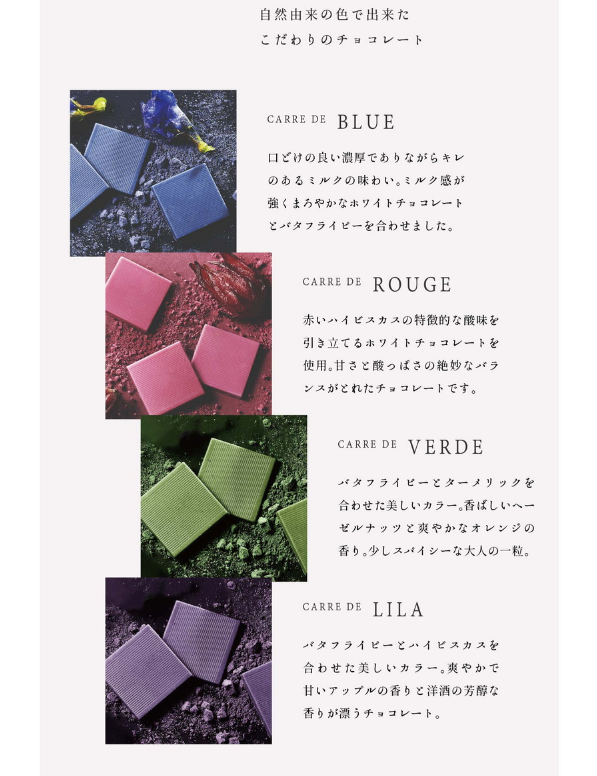 并且相比人工合成色素較高的飽和度,天然色素因提取自天然植物,無法做到與人工色素相媲美的高飽和色度,這也是曾經(jīng)人工合成色素被人們所青睞的原因之一,但是這一曾經(jīng)的“缺點”卻被日本天然色素品牌AGRI LIFE化解,因“日式美學(xué)”常強調(diào)色彩的低飽和度,AGRI LIFE便與日本知名巧克力制造商YOKOI CHOCOLATE聯(lián)合推出以超細植物粉末制成的天然著色劑為賣點的高級手工巧克力,產(chǎn)品所含的天然色素:花青素和葉綠素成分來自蝶豆花、洛神花及抹茶等天然材料,并通過將藍色與紅色的色素粉末以一定比例混合,制成了獨特的“丁香色”,同時配合高級的食材,使產(chǎn)品成為了情人節(jié)的熱銷產(chǎn)品,同時銷量突破10萬盒。