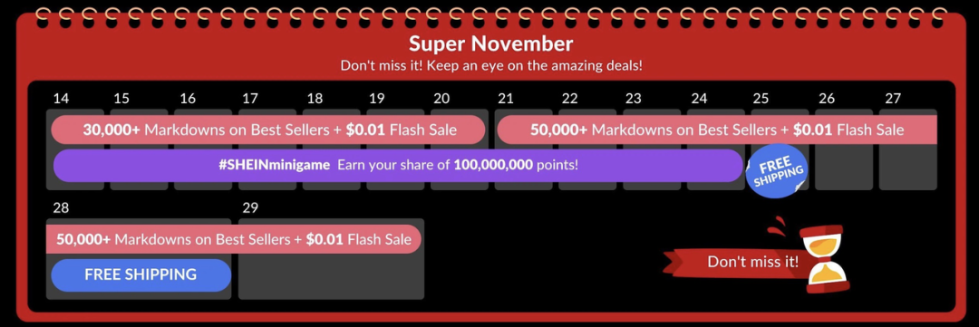 以時尚、低價而聞名的SHEIN在11月推出從14日到29日的“Super November”。其間,SHEIN的折扣力度高達85%,部分限時搶購商品只需0.01美元。對于黑五期間首次下單的用戶,SHEIN還會提供更多積分點數(shù)、專屬折扣等。