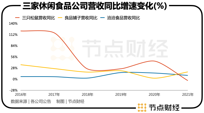 節(jié)點財經(jīng)分析發(fā)現(xiàn),當(dāng)時線上渠道占比最高的三只松鼠成長性是最好的,線上渠道占比近一半的良品鋪子次之,依賴線下商超渠道的洽洽食品反而是最差的。這就說明,三只松鼠與良品鋪子彼時的收入高增速來自電商渠道紅利。