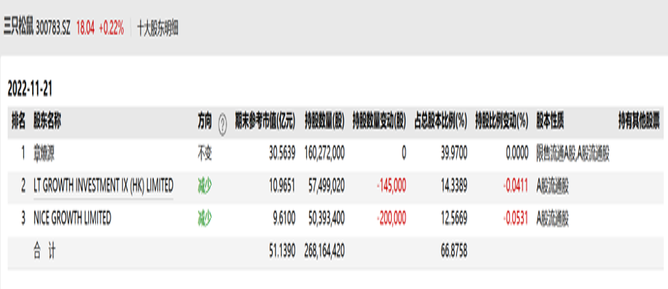 除了重倉良品鋪子,今日資本旗下的“LT GROWTH INVESTMENT IX (HK) LIMITED”還是另一家休閑食品巨頭三只松鼠的第二大股東。截至11月21日,其持有三只松鼠0.57億的股份,占公司總股本的約14.34%。