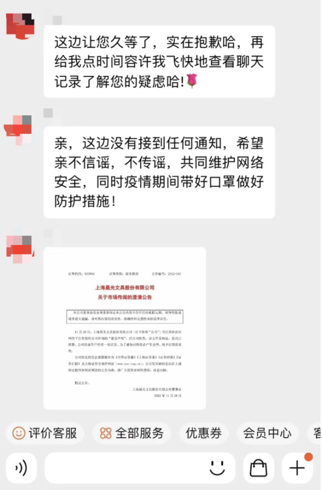 還有淘寶商家回復稱:“沒有接到任何通知,希望親不信謠,不傳謠,共同維護網(wǎng)絡安全。”該商家還附上晨光股份的澄清公告。