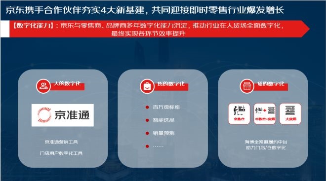 數(shù)字化能力建設(shè),依托京東與零售商、品牌商多年數(shù)字化能力沉淀,例如通過升級(jí)京東域內(nèi)營(yíng)銷工具京準(zhǔn)通的LBS功能,精準(zhǔn)服務(wù)門店附近的用戶。以及利用百萬(wàn)級(jí)標(biāo)庫(kù)、智能選品、銷量預(yù)測(cè)等等數(shù)字化商品管理工具、海博全渠道履約中臺(tái)能力,推動(dòng)行業(yè)在人、貨、場(chǎng)全面數(shù)字化,最終實(shí)現(xiàn)各環(huán)節(jié)效率提升。