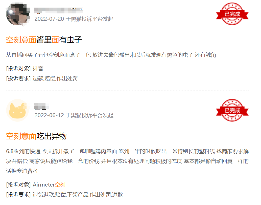 此前,就有消費者投訴稱購買到的空刻意面出現(xiàn)內(nèi)包裝嚴重發(fā)霉、包裝破損等情況。根據(jù)黑貓投訴平臺顯示,截止目前,有關空刻意面的投訴數(shù)量有21條,主要的問題涉及產(chǎn)品有異物、變質。包裝損壞等問題。
