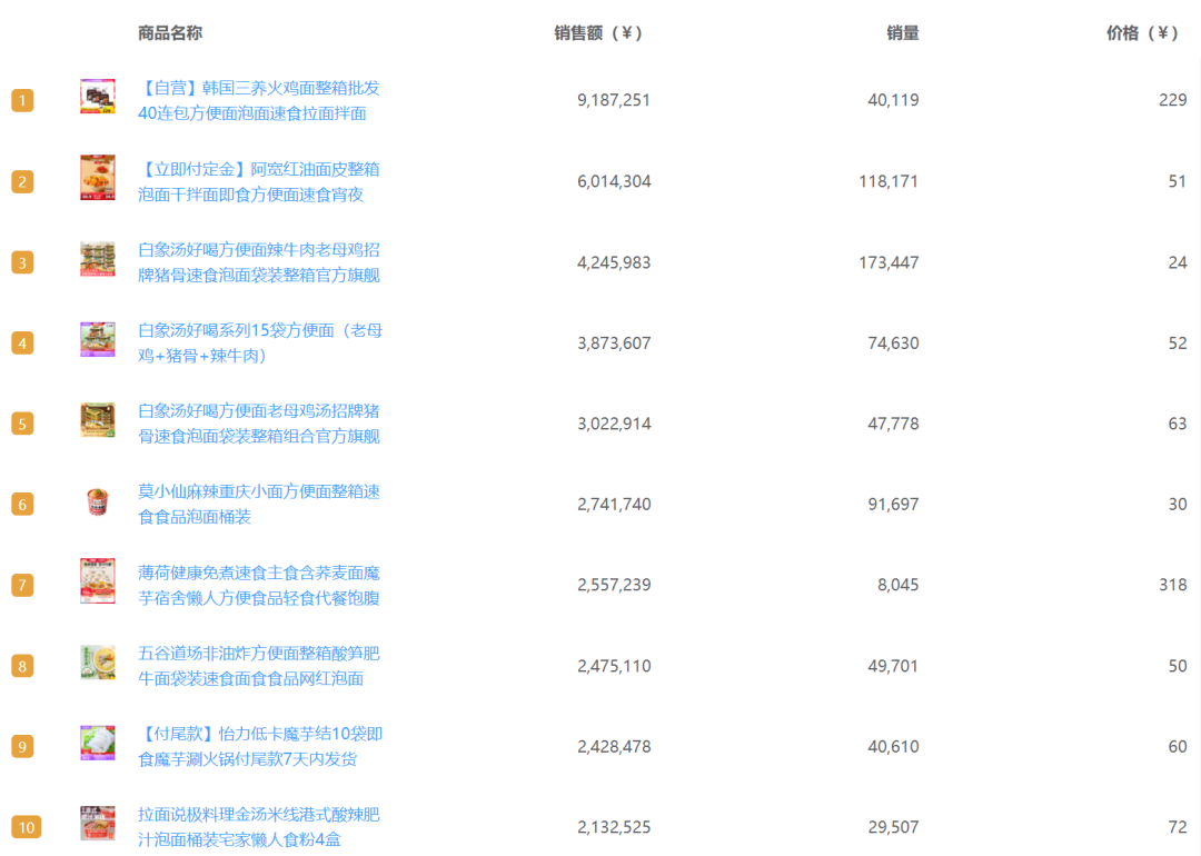 魔鏡市場情報2022年雙11天貓沖泡方便面/拉面/面皮類目商品排行榜