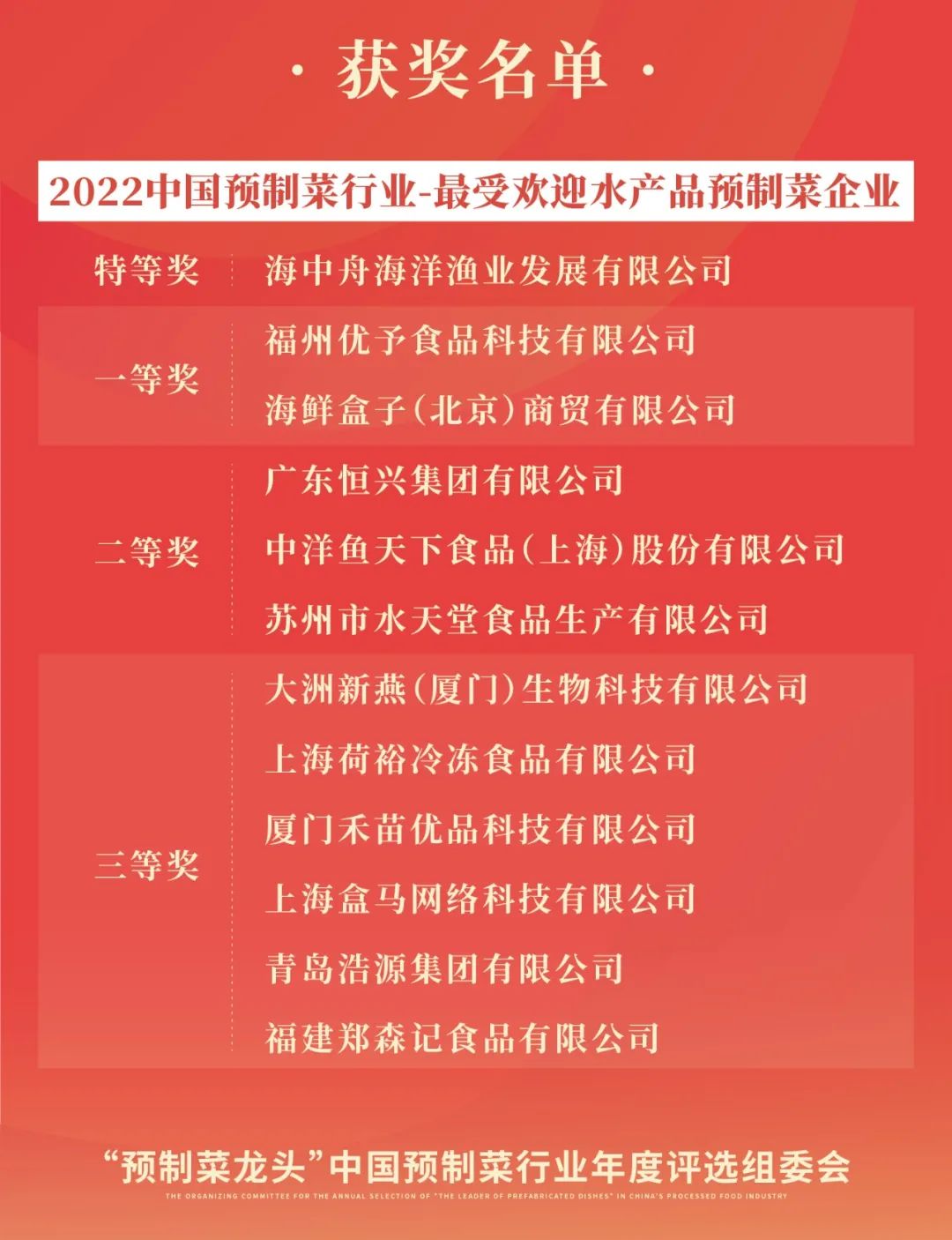 恭喜以上獲獎(jiǎng)的企業(yè)和個(gè)人!“‘預(yù)制菜龍頭’2022中國預(yù)制菜行業(yè)年度評(píng)選”頒獎(jiǎng)典禮將于2022年12月8日晚在福州“第2屆中國預(yù)制菜產(chǎn)業(yè)大會(huì)暨展會(huì)歡迎晚宴”上舉行!預(yù)制菜行業(yè)領(lǐng)軍品牌、卓越人物以及來自研發(fā)、渠道、水產(chǎn)品、肉禽產(chǎn)品、凈菜、復(fù)合調(diào)味料、設(shè)計(jì)包裝、機(jī)械設(shè)備等各領(lǐng)域的龍頭企業(yè)將薈萃福州,接受屬于他們的榮譽(yù),近百位行業(yè)大咖將驚艷亮相,并為獲獎(jiǎng)?wù)哳C獎(jiǎng)。讓我們一同期待這場(chǎng)高逼格的頒獎(jiǎng)盛典!