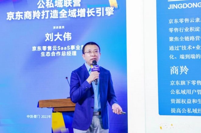 京東零售云受邀出席大會(huì),向行業(yè)受眾展現(xiàn)了門店全鏈路數(shù)字化解決方案,京東零售云SaaS事業(yè)部生態(tài)合作負(fù)責(zé)人劉大偉還在現(xiàn)場(chǎng)作主題演講,向業(yè)界展示京東零售云公私域聯(lián)營(yíng)解決方案——京東商羚多端商城。