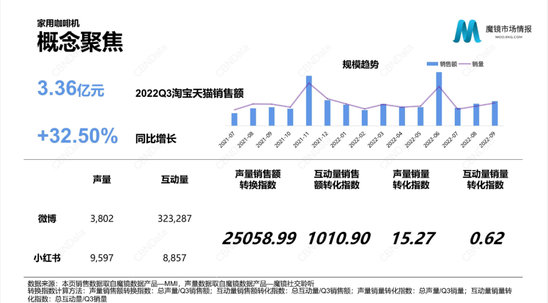 畢竟,在高速增長的中國咖啡市場,“精致便捷”的咖啡同樣是大勢所趨,而在魔鏡市場市場情報(bào)《2022年Q3消費(fèi)新潛力白皮書》中,“家用咖啡機(jī)”也已經(jīng)成為一個(gè)高增長概念。