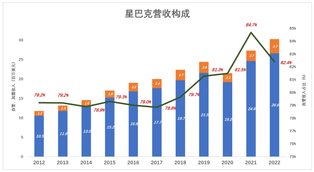2017年之前,星巴克在全球業(yè)務(wù)中自營收入占比低于80%;2018年開始小幅上升到80%以上,與在中國采取“全自營”不無關(guān)系。