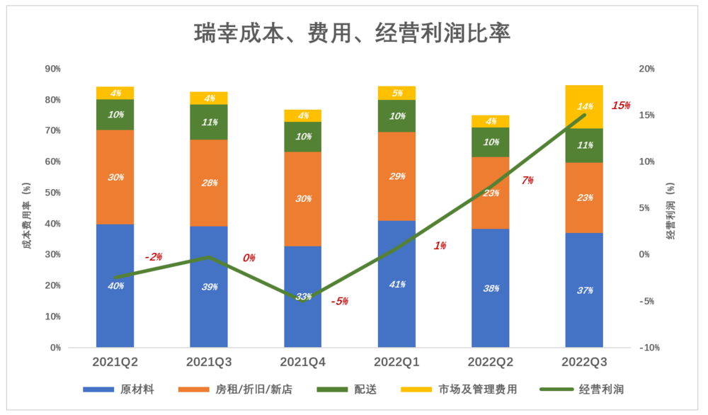 原材料成本不相上下,門店相關(guān)成本較星巴克中國將近20個百分點(diǎn),加上10%的配送成本,瑞幸仍然勝券在握。2022年Q3,瑞幸經(jīng)營利潤率達(dá)15%。