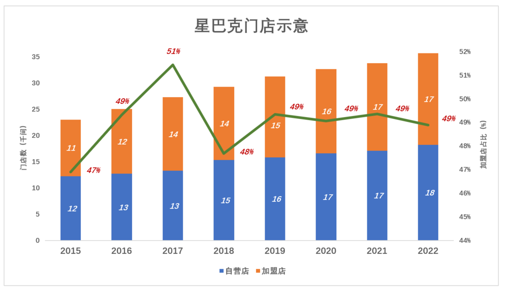 截至2022年10月2日(財年結(jié)束日),星巴克在全球擁有3.57萬間門店,其中加盟店占比為49%。過往四個財年,這個比例基本沒有變化。