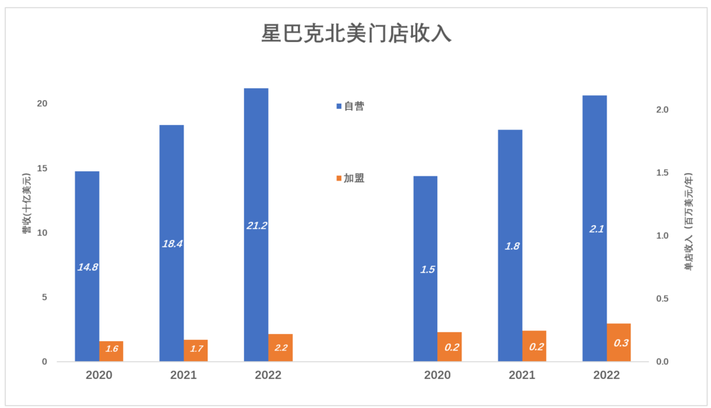 2022財年,星巴克北美加盟門店總收入達(dá)22億美元,單店年收入31萬美元(以年初、年末門店數(shù)均值為分母),較2020財年提高29.9%。