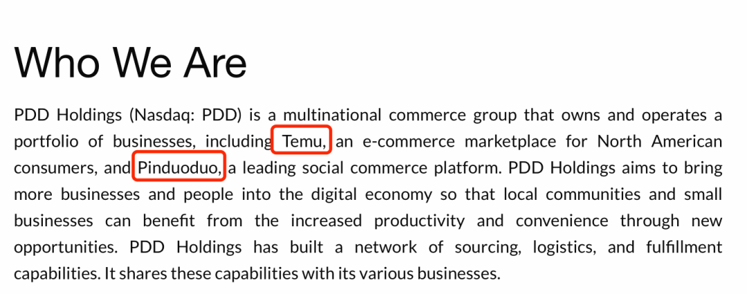 需要提及的是,三季報發(fā)布前,拼多多的投資者關(guān)系網(wǎng)頁啟用了新域名pddholdings.com,并將公司介紹改為,“一家擁有并經(jīng)營一系列業(yè)務(wù)的跨國商業(yè)集團(tuán),包括北美消費(fèi)者電子商務(wù)市場Temu和領(lǐng)先的社交商務(wù)平臺拼多多”。