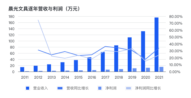 從2013年至2020年,晨光文具的營收由23.6億元增長至176.07億元,復(fù)合年均增長率高達25.02%;同期凈利潤也由2.76億元上升至10.60億元。