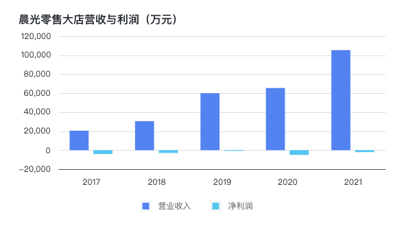 但零售大店對晨光的收入貢獻非常有限,而且仍處于虧損狀態(tài)。2021年,晨光生活館及九木雜物社實現(xiàn)營業(yè)收入10.5 億元,同比增長 60%,占總營收中的占比僅5.99%,凈虧損2108.65萬元。
