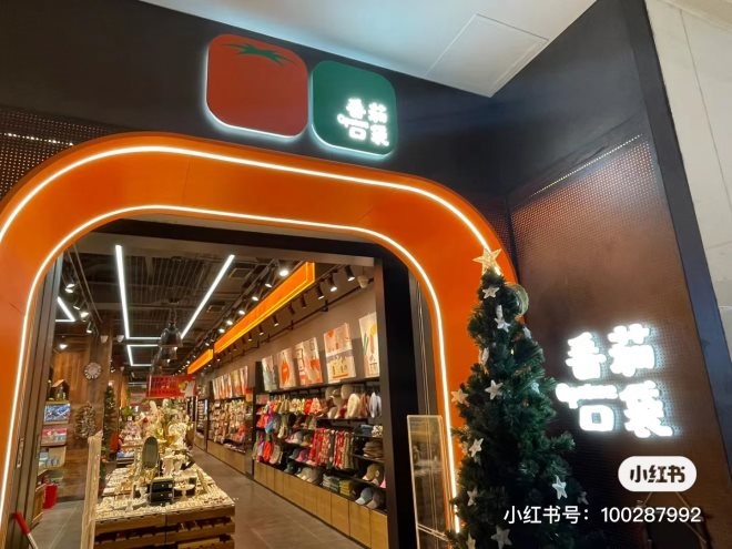 華南首店由于開(kāi)設(shè)恰逢12月圣誕季,大量的燈帶和紅色番茄玩偶從天花板垂下,首店圣誕氣息濃厚。此外,首店延續(xù)了北京門(mén)店的市集式的陳設(shè)風(fēng)格,給消費(fèi)者帶來(lái)逛集市的悠閑感。