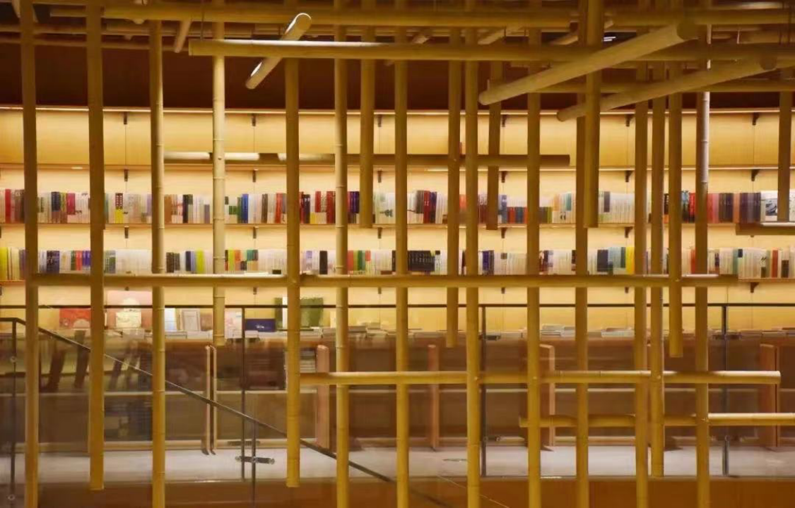 首店占地約1500平左右,分為上下兩層。整體風(fēng)格以中式江南庭院為主,竹子元素?cái)?shù)不勝數(shù),石壁水幕墻面、竹林穹頂、竹制書(shū)架……正門(mén)由竹竿規(guī)律交錯(cuò)擺放構(gòu)成,既達(dá)到了隔擋目的,又獲得了空間延伸感。由正門(mén)而入后,來(lái)到了中央舞臺(tái)區(qū)和兒童閱讀區(qū),左手邊為收銀區(qū)。