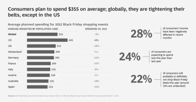除美國(guó)外,其余國(guó)家消費(fèi)者的黑五預(yù)算均同比下滑,圖源 / 波士頓咨詢報(bào)告