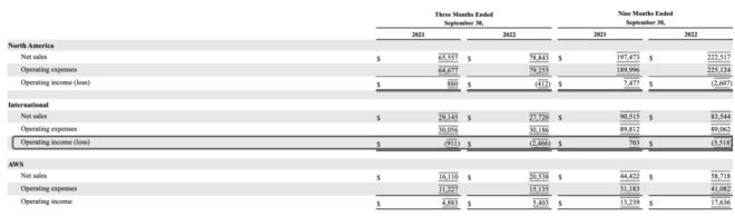 今年第三季度,亞馬遜全球市場(chǎng)虧損嚴(yán)重,圖源 / 亞馬遜2022年Q3財(cái)報(bào)
