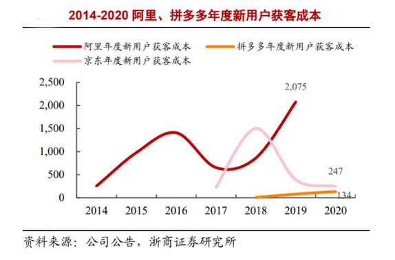 這也直接導(dǎo)致了淘特獲客成本的居高不下。公開資料顯示,2016年時(shí)拼多多新增用戶的獲客成本僅為10元/人,而同一時(shí)期淘寶、京東的獲客成本分別達(dá)到了166元和142元。