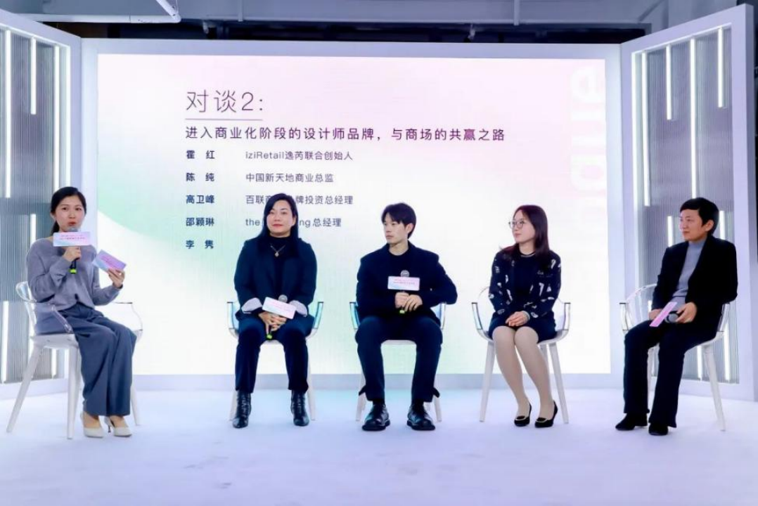 之后關于“進入商業(yè)化階段的設計師品牌,與商場的共贏之路”的話題,由逸芮聯(lián)合創(chuàng)始人霍紅主持,百聯(lián)商業(yè)品牌投資總經理高衛(wèi)峰、the bálancing總經理邵穎琳、瑞安新天地商業(yè)總監(jiān)陳純、設計師品牌JUNLI創(chuàng)始人李駿作為嘉賓展開,深入探討了商場和設計師品牌之間更理性、更具長期主義的合作共創(chuàng)可能性。