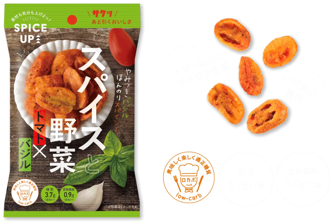 日本無負罪感果蔬零食「スパイスアップ!」推出了一系列由香辛料調(diào)味的蔬菜脆片零食,其中就包含使用圣女果制成的番茄脆片。將番茄切塊速凍后,通過低溫真空狀態(tài)油炸蔬菜,不破壞食材的色香味,保持鮮美本味。每包番茄干(11g)含有0.9g纖維和僅3.7g糖,可以用作沙拉等的澆頭,也可作為佐酒小菜。