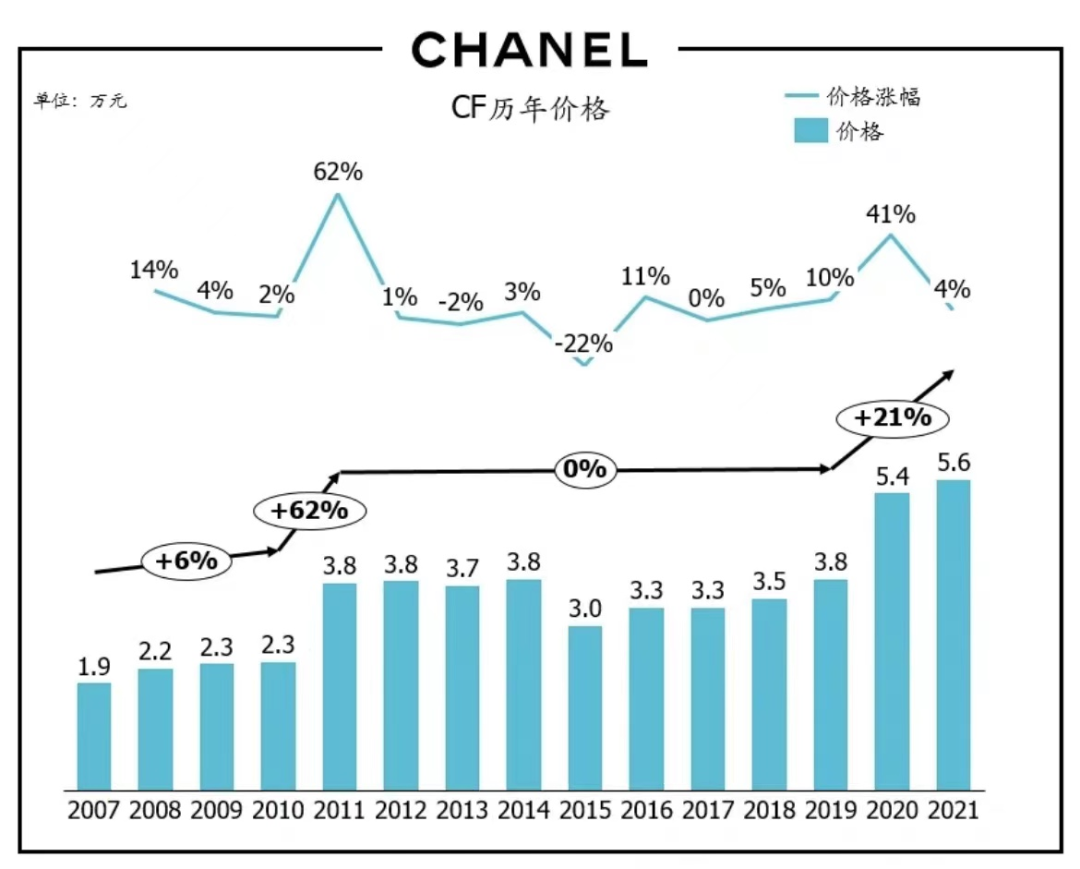 香奈兒在疫情期間經(jīng)歷了一輪猛漲。CF系列在2020年底價格第一次漲到5萬以上,2021年底又繼續(xù)破6萬。今年11月初,香奈兒開始了新的漲價動作。其中CF系列小號經(jīng)典手袋從5.86萬漲到6.19萬,中號從6.27萬漲到6.65萬,大號手袋的售價首次破7萬,從6.75萬漲到了7萬1。