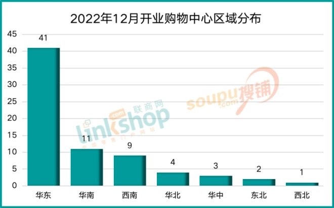 從區(qū)域來看,華東成為當(dāng)之無愧的領(lǐng)跑王,共將開業(yè)41個商業(yè)項目,華南以11家開業(yè)項目的“成績”緊隨其后,西南將開業(yè)9家商業(yè)項目,位列第三。西北擬新開項目最少,只有1個。