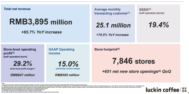 數(shù)據(jù)顯示,瑞幸咖啡Q3自營門店銷售額增長率為19.4%,但是往前回溯,2021年四個季度的此項數(shù)值都在70%以上。