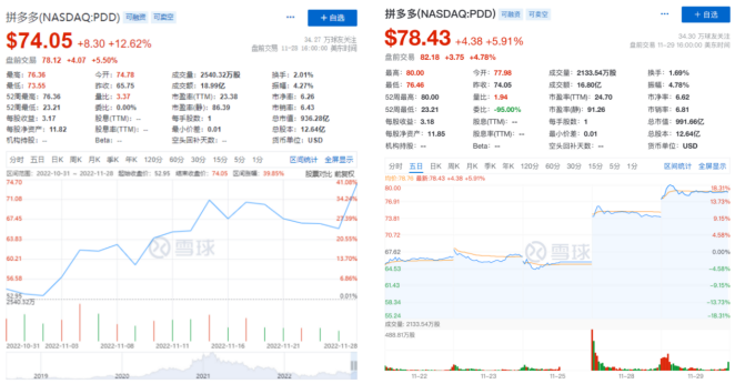 財報披露當天,拼多多的收盤價漲幅高達12.6%,股價為74.05美元/股,成為近一年來拼多多的最高收盤價。此后,拼多多股價繼續(xù)攀升,截至11月29日收盤,報78.43美元/股。
